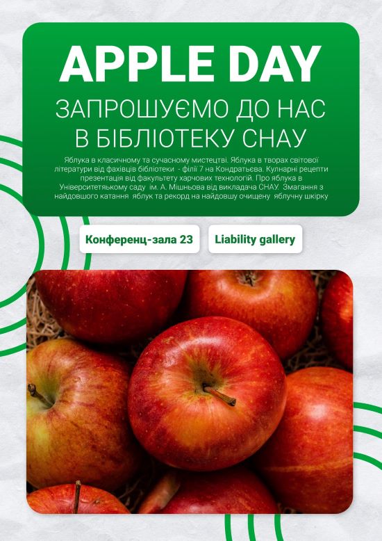 21 жовтня відзначається Всесвітній день яблука. Це свято, започатковане у Великій Британії у 1990 році, присвячене яблукам та фруктовим садам. День яблука підкреслює важливість яблук як корисного та популярного фрукта і нагадує про значення садівництва. Про яблука в художній літературі та мистецтві, про кулінарні рецепти від факультету харчових технологій та вирощування яблук в університетському саду ім. А.К. Мішньова говорили в бібліотеці СНАУ, де спільно з бібліотекою-філією 7 на Кондратьєва та відділом з організації виховної роботи зі студентами святкували Apple day. Веселими виявились розваги з яблуками: катання яблук на швидкість та на найдовшу яблучну шкірку, а призами були пиріжки з яблуками від кулінарів комплексу громадського харчування.