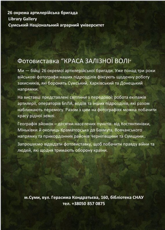 Сьогодні в арт галереї бібліотеки СНАУ чергова виставка. Але саме сьогодні вона носить не простий, а суспільно значимий характер. 26 окрема артилерійська бригада ім. Романа Дашкевича надала до показу свої фотороботи з життя, побуту та служби під назвою : «Краса залізної волі». Це проєкт, що побував у ряді міст України. Географія територій бере початок від Донеччини до Харківщини, Чернігівщини та Сумщини.